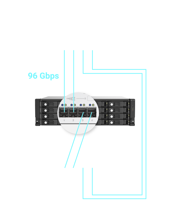 Il TL-R1620Sep-RP utilizza un estensore SAS SAS35x36R a bassa potenza da 28nm oltre a supportare le unità SAS/SATA da 12/6 Gb/s. Dispone inoltre di quattro porte 12 Gb/s SAS 3.0 (x4 Lane) SFF-8644 SAS Wide. Collegando il TL-R1620Sep-RP a un server Windows host che supporta l’indirizzamento multipath (I/O multipath, MPIO) e il collegamento a margherita di più JBOD con due porte wide configurate con link aggregation, è possibile ottenere velocità di trasferimento fino a 96Gb/s.