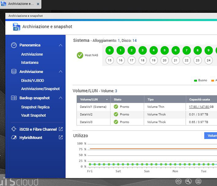 QuTScloudを探し出したITOneは、VMware vSphere上でQuTScloudインスタンスを起動し、QuTScloud専用の13基の物理ドライブ(SSD、SASおよびSATAドライブで構成)を提供するSASコントローラへのパススルーを利用しました。ITOneでは、このQuTScloudアプライアンスをテストし、CIFSを使用したデータ共有と、vSphere内のデータストアでNFS/iSCSIを経由しデータ共有を行いました。