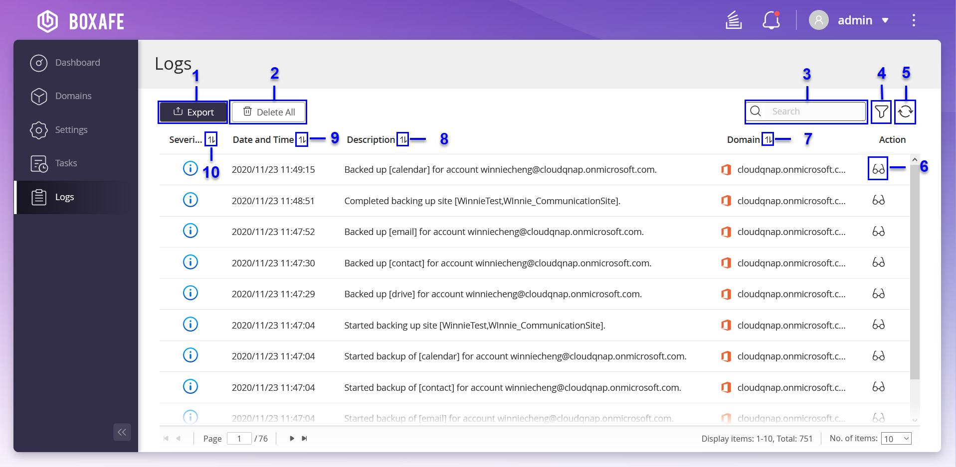 [ログ]画面では、各イベントに関連したセキュリティ、日付と時刻、説明、ドメインが表示されます。すべてのログをエクスポートまたは削除できます。
