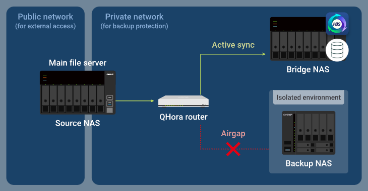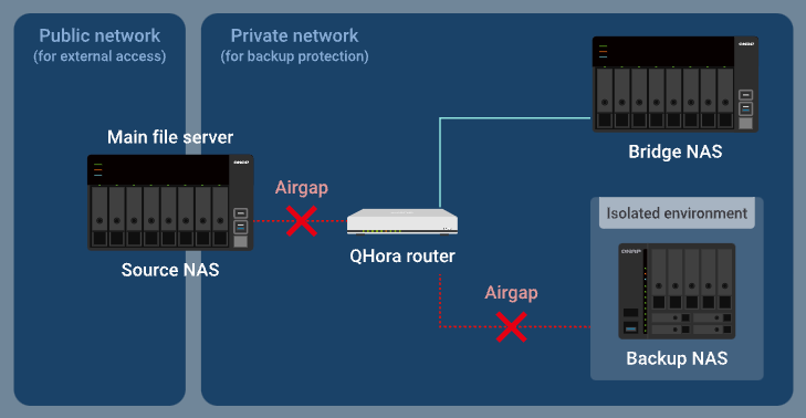 Airgap+をサポートするQNAPルーターにQNAP NASデバイスを接続することで、HBS(Hybrid Backup Sync)がバックアップまたは同期ジョブを実行しているときに、ルーターがNASデバイス間の接続のみを許可するプライベートネットワークを作成することができます。ルーターは、他の時間帯にバックアップNASへの他の接続要求をすべて拒否し、バックアップデータを隔離して保護します。