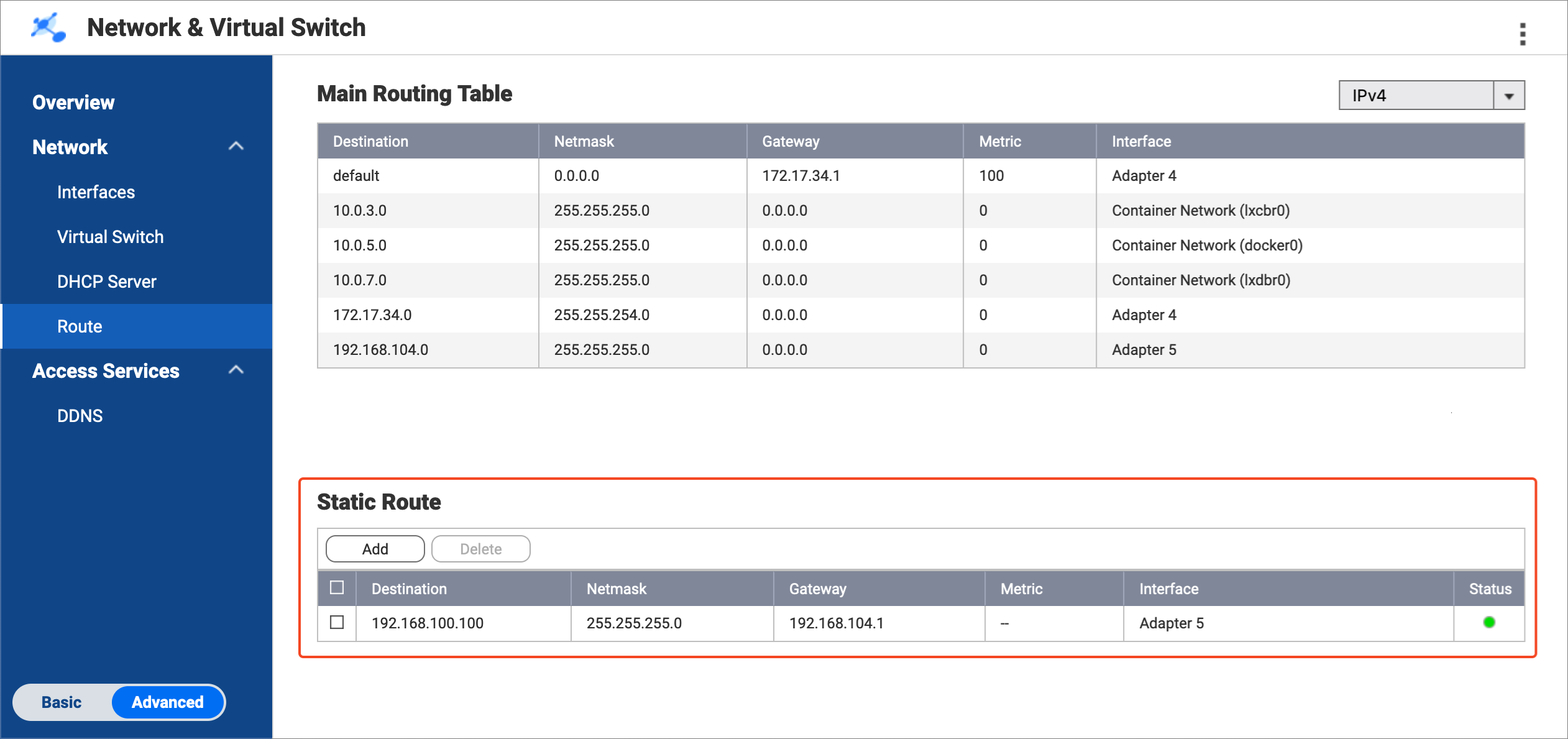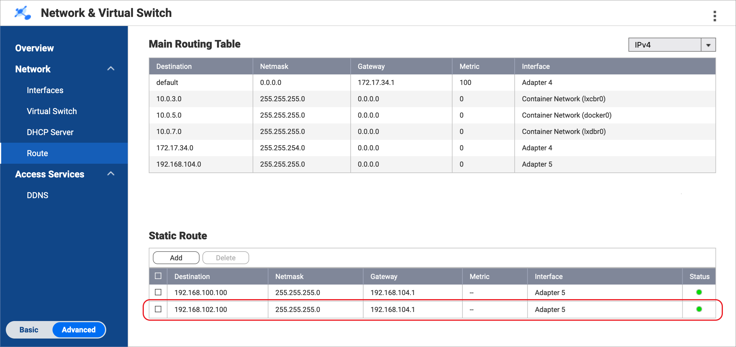 1. ブリッジNASで、[ネットワークと仮想スイッチ] > [ネットワーク] > [ルート] の順に選択します。
