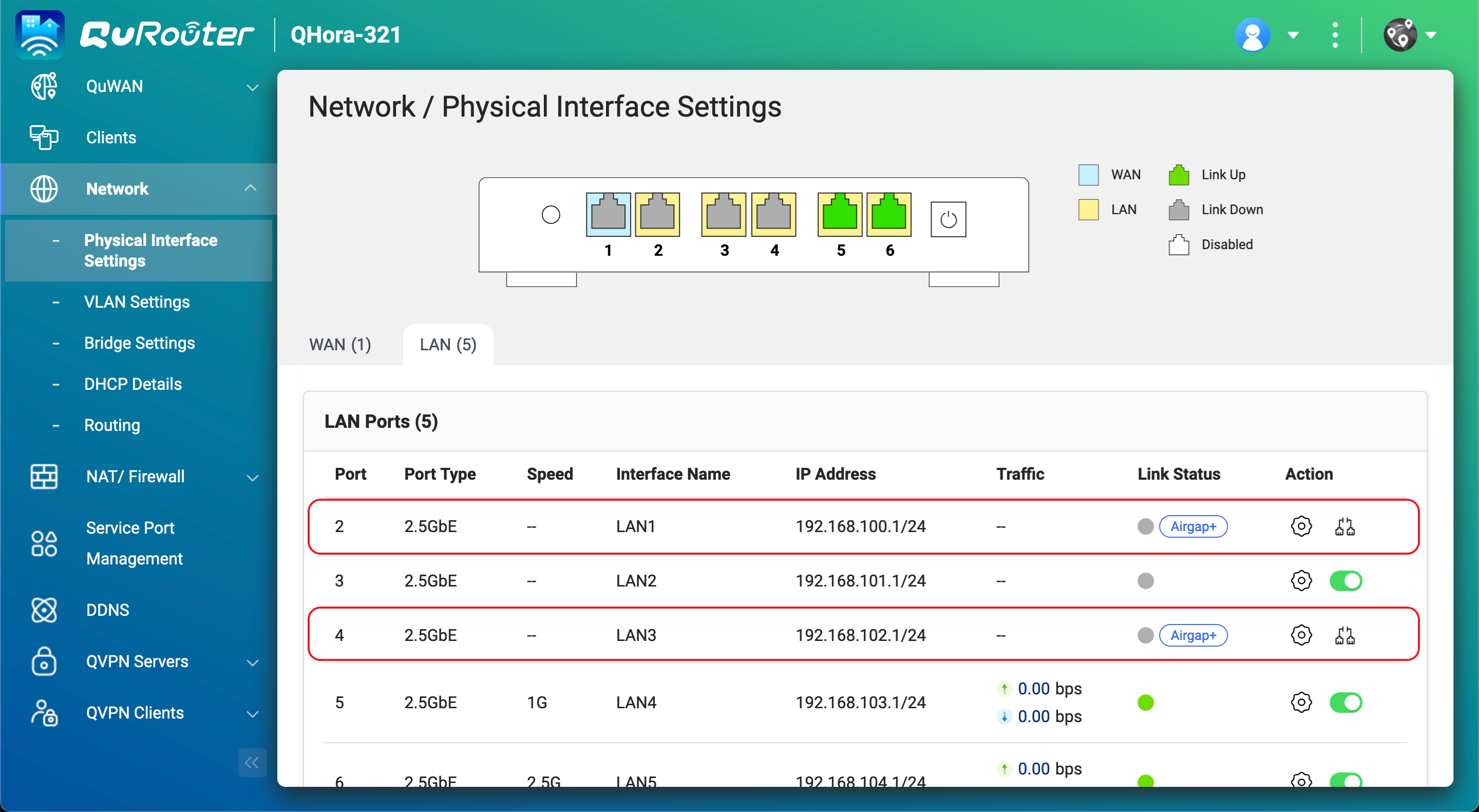 1. QuRouterで[ネットワーク] > [物理インターフェイス設定] > [LAN] に移動します。