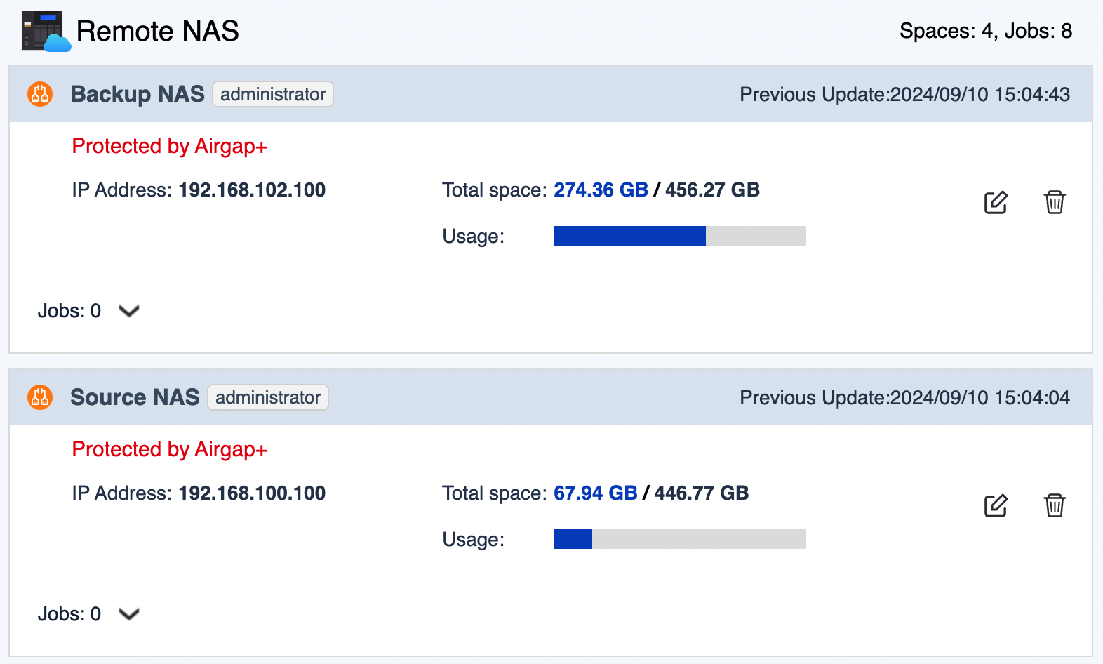 両方のストレージスペースが作成された後、[HBS] > [ストレージ領域] のエントリの上部に「Airgap+による保護」と表示されるはずです。