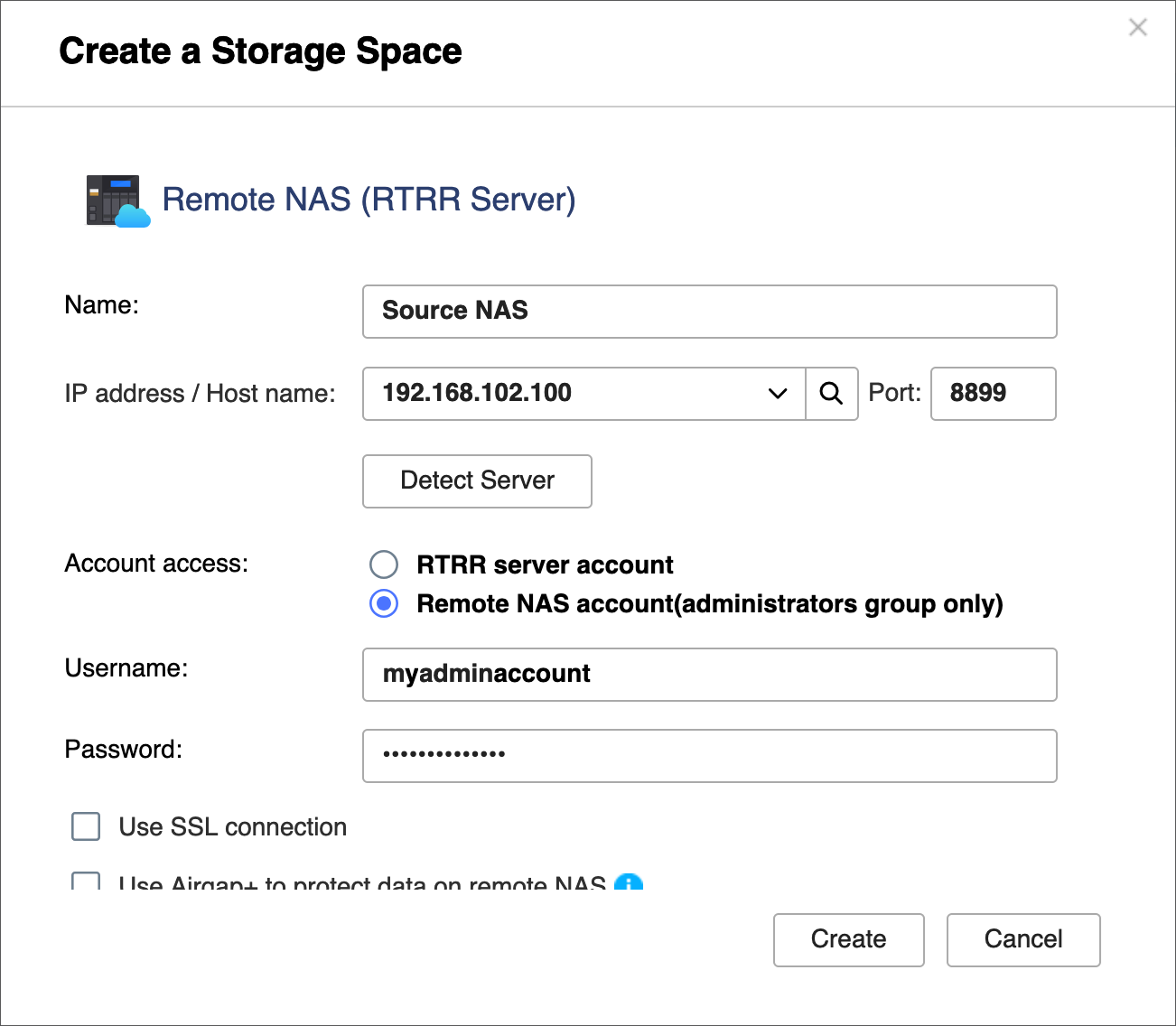 7. ソースNASのRTRRサーバー設定で構成したアカウントアクセス方法を選択します(手順C-8dを参照)。