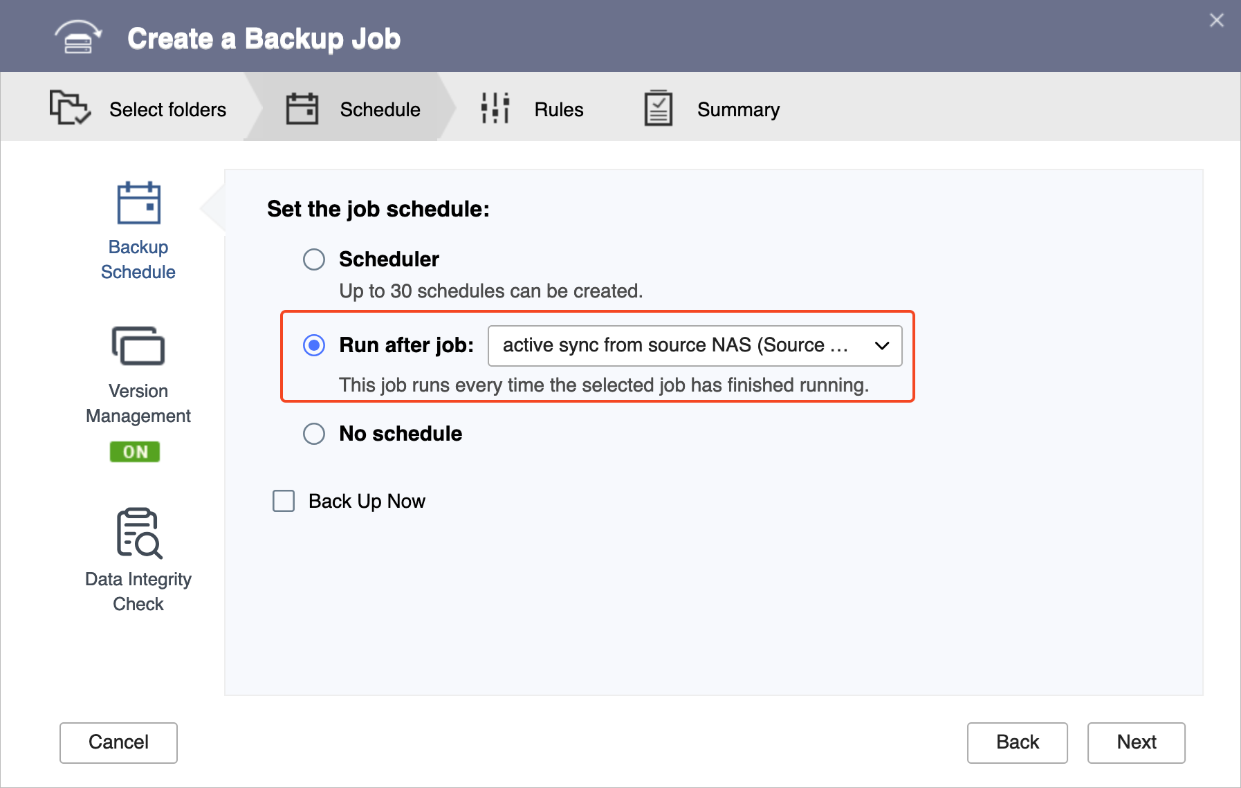 これにより、アクティブ同期ジョブが終了するたびにバックアップジョブが自動的に実行され、バックアップデータのバックアップNASへの転送が完了します。