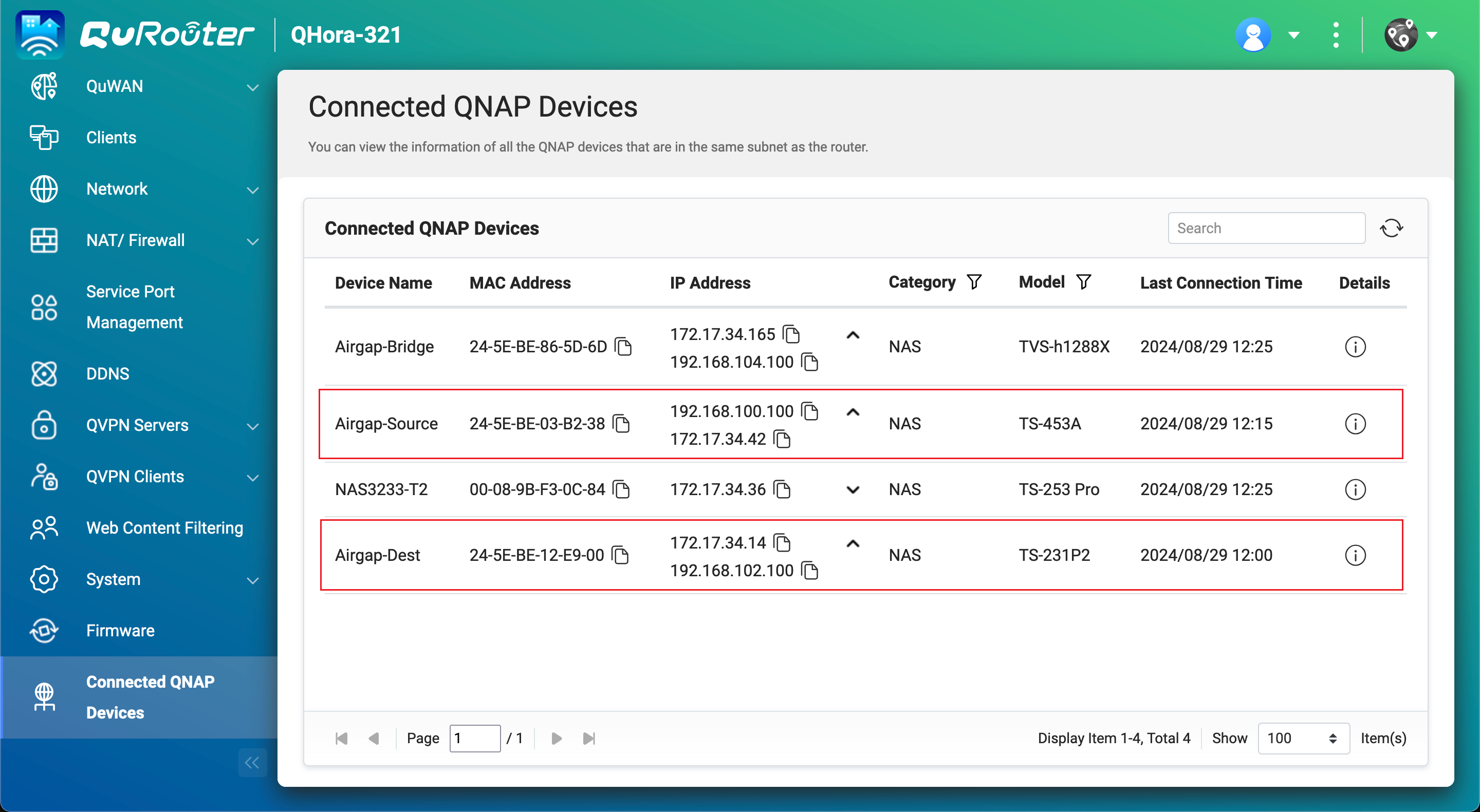 4. ソースとバックアップのNASデバイスに接続されているAirgap+ルーターのLANポートのIPアドレスを取得します。