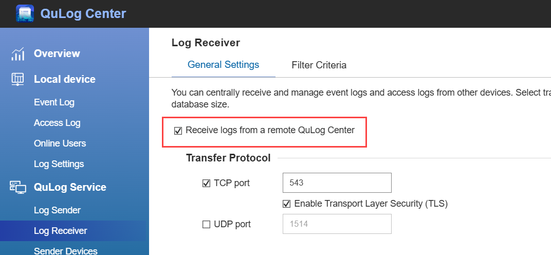 QuLog Centerは、1つ以上のフィルター条件と一致するログのみを受信します。詳細は、QTSユーザーガイドまたはQuTS heroユーザーガイドの「QuLog Center」の「ログ受信側設定の構成」をご覧ください。