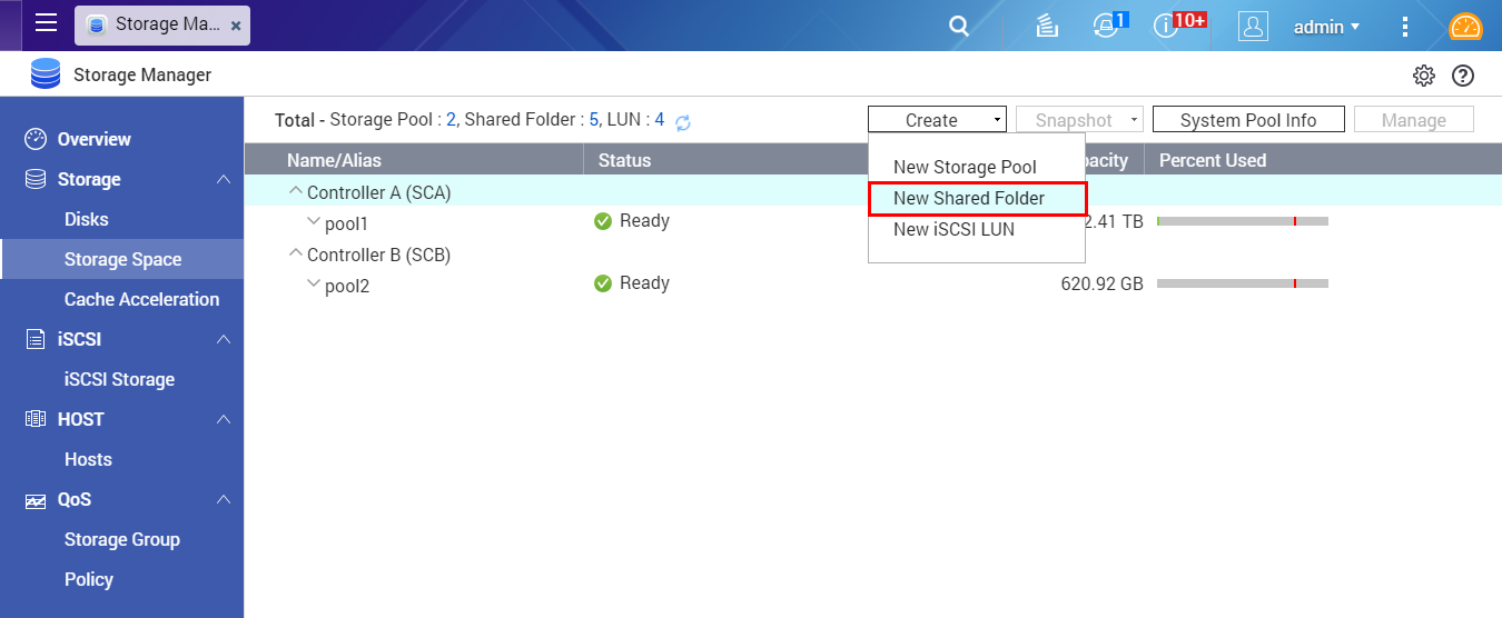 Step 2: Go to “Storage Space”, click "Create" > "New Shared Folder”.