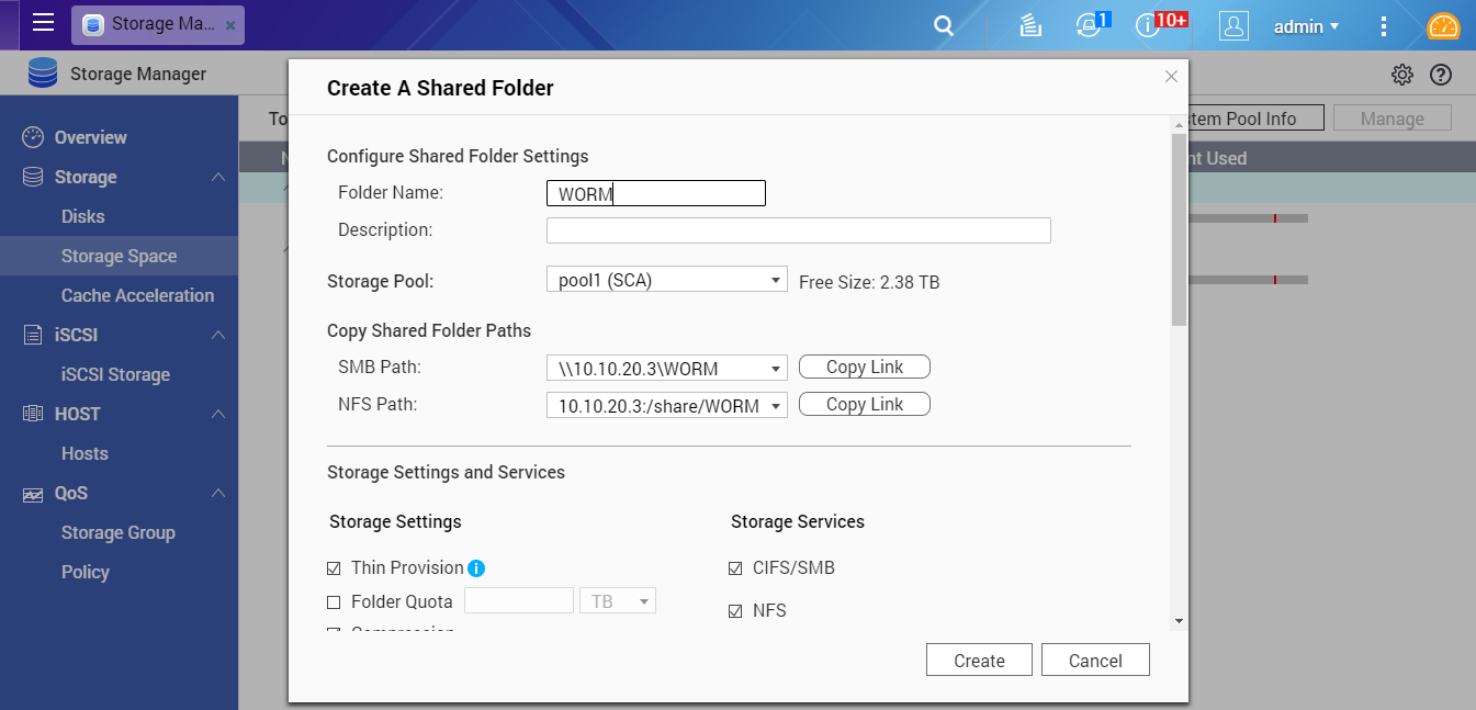 Step 3: Enter the desired WORM folder name. In "Storage Settings", set the WORM storage quota, and select other options according to different application scenarios. If there are no special requirements, you can just select the default values.