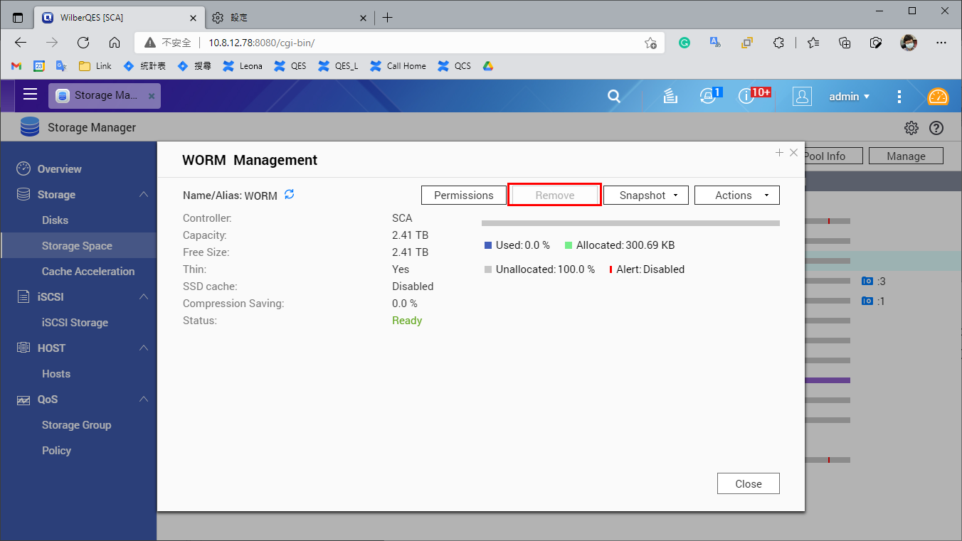 Note: If the WORM type is set as “Compliance”, the remove option (in “Actions”) is disabled.
