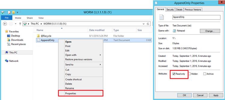 Step 3: Right-click the file, select “Properties” and check Read-only. This file will become Append Only.