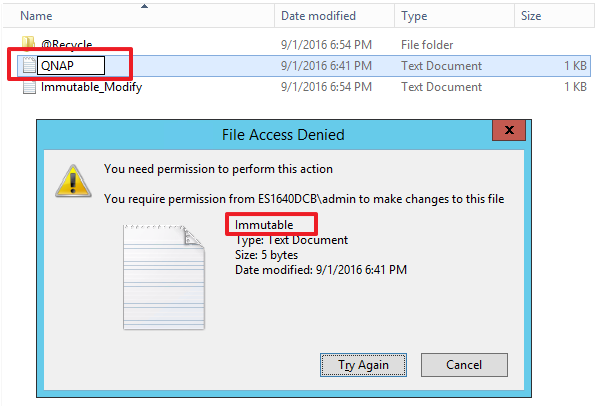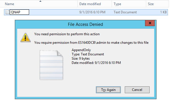 Step 2: Change the file name to "QNAP" and press Enter. The "File Access Denied - Append Only" alert window will appear. We do not have permission to change the file name, confirming that file name cannot be changed in Append Only state.