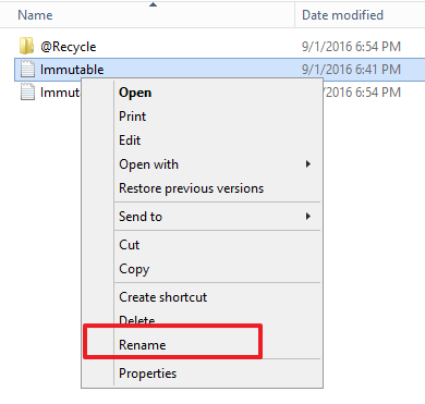 Step 1: Right click the “Immutable” file and select “Rename”.