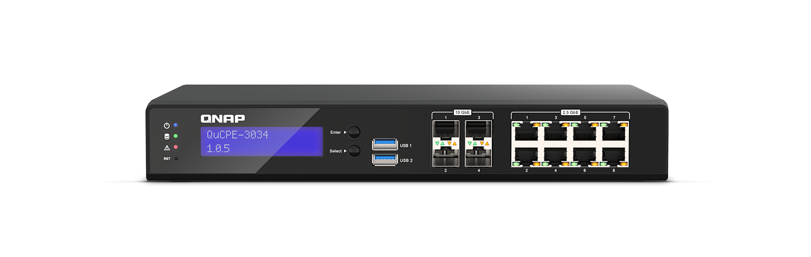 QNAP製QuCPE-3034ネットワーク仮想化構内設備は、特にSMB向けに設計された汎用仮想化プラットフォームです。QuCPE-3034は、 高性能 Intel® Atom Refresh 8コアプロセッサ搭載で、Intel® QAT、Smart NIC SR-IOV、DPDKハードウェアアクセラレーションテクノロジー対応、また、8つの2.5GbE RJ45ポートおよび4つの10GbE SFP+ポートを備えています。強化された帯域幅と演算性能で、VNFの稼働およびSD-WAN (VPN/WireGuardサポート)に対応するQuCPE-3034は、マルチユーザーおよびマルチタスクのビジネスアプリケーションにおいて最適です。また、QuCPE-3034はVNFサービスのチェイニングおよびAMIZクラウド集中展開用のQNE (QNAP Network Equipment) OS、フレキシブルなゼロタッチプロビジョニングを実現する管理プラットフォームを備えています。
