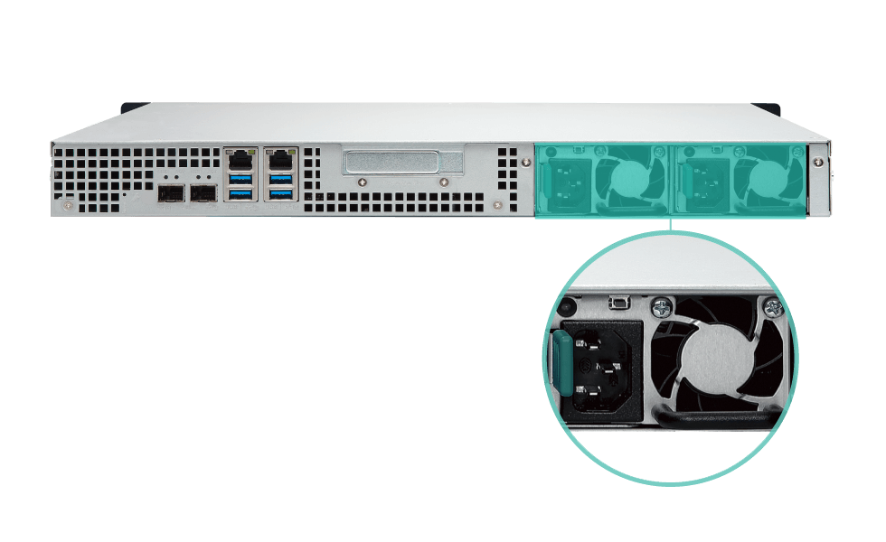 TS-432XU-RP には冗長電源が装備されており、高い信頼性を実現するサービス稼働率の最大化が図れます。デュアル 1000BASE-T とデュアル 10GbE SFP+ ポートを組み合わせることで、24 時間 365 日稼働の、費用効率の高い信頼できるストレージソリューションが保証されるビジネスが可能になります。