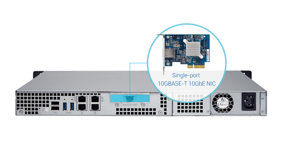 TS-463XUには、10GbE高速ネットワークを完全にサポートするシングルポートの10GBASE-Tイーサネットネットワークアダプターが事前に搭載されています。10GbEネットワークは、仮想化タスク、高速バックアップ&復元、大容量データのアプリケーションの速度を大幅に向上します。また、このネットワークを使用することで、NASとワークステーション間でビデオを転送せずに、オンラインのビデオ編集が可能になります。大容量ストレージのポテンシャルとともに、TS-463XUは、大量のデータを保存し、ITの柔軟性を活用したい企業に理想的です。