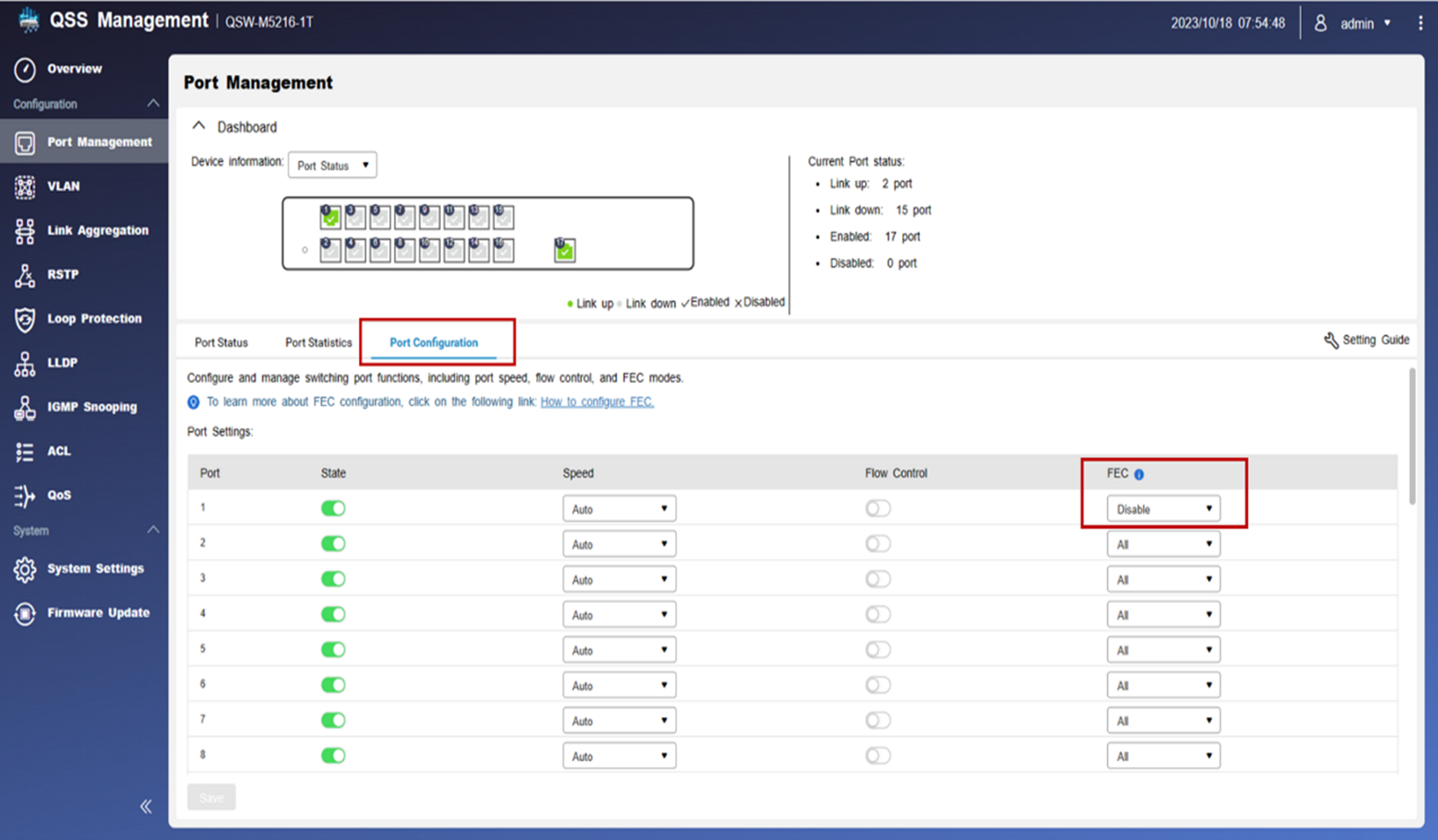 팁인터페이스에 적용된 현재 FEC 모드를 보려면 포트 관리 > 포트 상태로 이동합니다. - 저장을 클릭합니다.