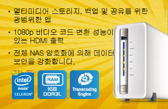 TS-251C: 2-베이 타워형 모델, 듀얼 코어 Intel® Celeron® 2.41GHz 프로세서, 1GB DDR3L RAM, 3.5” SATA HDD, USB 3.0 1개, USB 2.0 2개, 기가비트 LAN 포트 1개, HDMI 출력(v1.4a, 1080p)