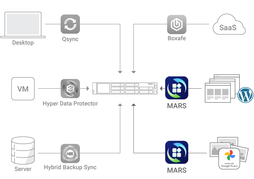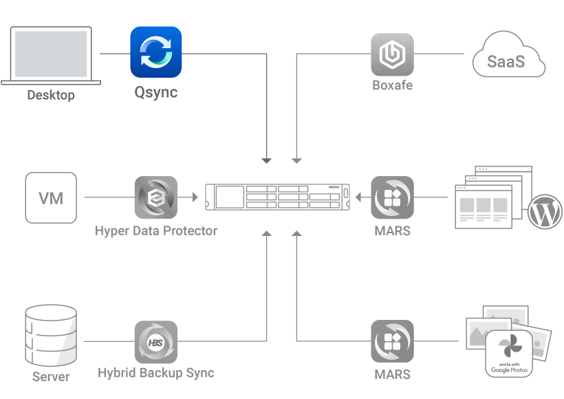 페타바이트 규모의 스토리지 용량을 위해 TS-855eU-RP를 SAS 12Gb/s 또는 SATA 6Gb/s 확장 장치에 연결할 수 있습니다.