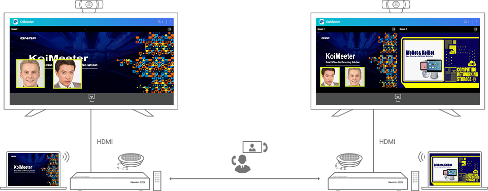 QNAP KoiMeeter의 고품질 비디오 컨퍼런스 시스템은 무선 프레젠테이션, 크로스 플랫폼 통신 및 로컬 스토리지를 지원하는 중소 규모의 회의실을 위한 이상적인 솔루션입니다.