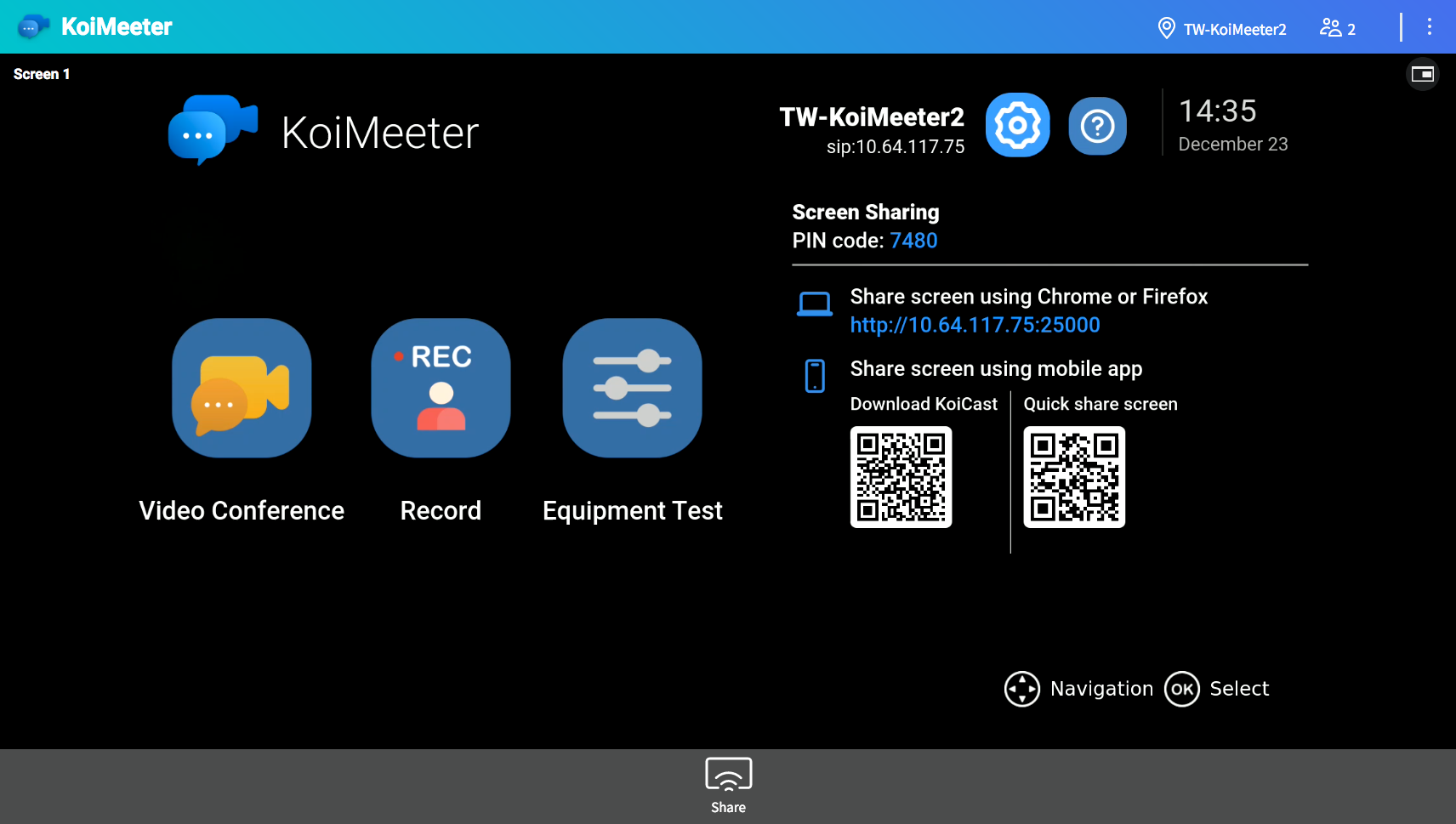 KoiMeeter는 무선 프레젠테이션 기능을 갖추고 있으며, 발표자가 TV 화면에 표시되는 IP 주소에 연결하여 추가적인 무선 프로젝터, 동글 또는 소프트웨어 없이도 화면을 공유할 수 있습니다. 미팅 참가자는 Insight View 기능을 사용하여 컴퓨터에서 프레젠테이션을 볼 수 있습니다. 또한 모든 통신의 복사본을 제공하기 위해 미팅을 직접 저장할 수도 있습니다.