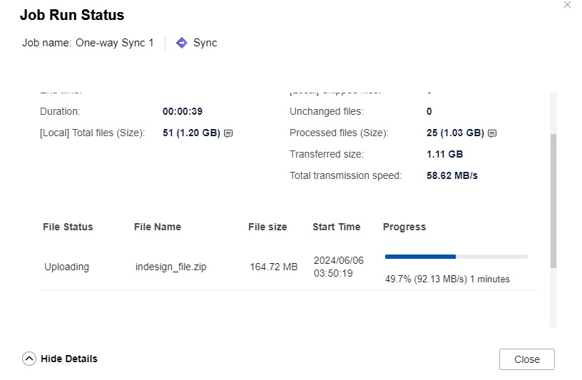 If you want to do some speed test, try to set a sync job without any compression and encryption, sync just one big file about 10 GB which will be more precisely.