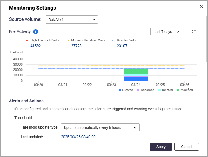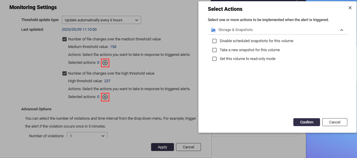 to select one or more actions that should be performed on the selected directory when the alert is triggered. - Click Apply to save the settings for the monitored source volume.