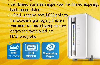 TS-251C: 2-bay torenmodel, Dual-core Intel® Celeron® 2,41 GHz processor, 1GB RAM DDR3L; 3,5" SATA HDD; 1 x USB 3.0; 2 x USB 2.0; 1 x Gigabit LAN-poort; HDMI-uitgang (v1.4a, 1080p).