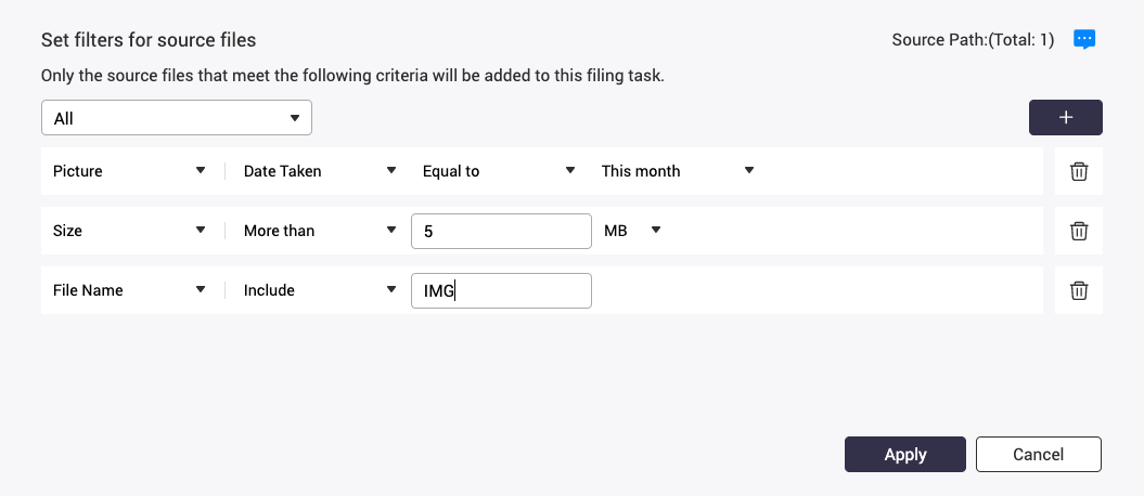 Selecteer het bronpad en gebruik filtercriteria (zoals sleutelwoorden in de bestandsnaam, bestandsgrootte, bewerkdatum enzovoort) om gefilterde bestanden direct naar de prullenbak te verplaatsen (voor verschillende criteria is de Qsirch app vereist).