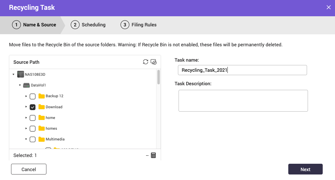 Qfiling werkt niet alleen op de lokale NAS maar kan ook externe opslagapparaten, externe NAS-systemen en gekoppelde ruimte in de cloudopslag bereiken (met HybridMount). Alleen geselecteerde categorieën zullen geback-upt / verplaatst worden naar de bestemming.