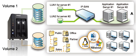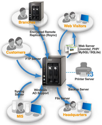 QNAP TS-239 Pro is the new generation 2-bay model of the worldwide award-winning Turbo NAS Series designed to deliver high performance and reliable server features such as advanced RAID protection, built-in iSCSI target service, and AES 256-bit volume-based encryption for small business. Powered by Intel 1.6 GHz CPU and 1GB DDRII memory, the TS-239 Pro is the 2-bay NAS with the best hardware specifications in the current market. The NAS comes with two Giga LAN ports which can be configured for network failover, load-balancing, and multi-IP setting. Advanced disk configurations such as RAID 0/ 1, JBOD, Online RAID Capacity Expansion and Online RAID Level Migration are supported. The TS-239 Pro can serve as a NAS and an iSCSI target server. You can make use of the iSCSI target service to set up the NAS as a device for storage capacity expansion or a backup server of the existing servers on the local network. The “Virtual Space Allocation” (Thin Provisioning) feature is provided that you can flexibly allocate the capacity of iSCSI LUN (Logical Unit Number) at the beginning regardless of the physical volume capacity of the NAS. To meet the demand for high security data protection of the business users, the TS-239 Pro supports AES 256-bit volume-based encryption. The encrypted disk volumes of the NAS must be unlocked by the encryption password to be accessed, which eliminates the fear of confidential data leakage if the hard drives or the NAS were stolen. Moreover, the TS-239 Pro supports file sharing across Linux, UNIX, Mac, and Windows. It provides numerous applications, e.g. file server, FTP server, printer server, web server (with phpMyAdmin, MySQL, SQLite, Joomla!). It is an ideal storage solution for your office network. Brand new user Interface available Feature-rich Applications for Business The TS-239 Pro supports file sharing across Linux, UNIX, Mac, and Windows platforms. Different applications are supported, e.g. file server, FTP server, printer server, web server, and encrypted remote replication. Also, windows AD (Active Directory) is supported to help create an easy-to-access environment and lower the maintenance cost. SSH login and web page SSL login enable users to transfer, store, and share data securely.  The Most Affordable and Flexible iSCSI Solution The TS-239 Pro can serve as a NAS and an iSCSI target server. The built-in iSCSI target feature provides an affordable IP-SAN (Storage Area Network) alternative for SMB. You can set up the NAS to expand the storage capacity for existing application servers, such as database server and mail server in an economic way. Moreover, the "Virtual Space Allocation" (Thin Provisioning) feature is provided which allows you to flexibly allocate the capacity of iSCSI LUN (Logical Unit Number) at the beginning regardless of the physical volume capacity. Secure Data Protection by AES 256-bit Volume-based Encryption The TS-239 Pro's dominant "volume-based encryption" feature secures the server data by AES 256-bit encryption. Even if the hard drives were stolen, there is no need to fear that the confidential data would be leaked since the data can only be accessed by an authorized password. *Note: Data encryption functions may not be available in accordance to legislative restrictions of some countries. Benefits of Dual Gigabit LAN Deployment Failover Supported for Network Reliability The dual LAN ports can be configured as failover which allows the NAS server to sustain the failure of one network port to provide continuous services. Better Performance with Load Balancing The two LAN ports of the NAS can be configured as load balancing mode for bandwidth aggregation to boost the file transfer speed (works with managed Ethernet switch with 802.3ad configured). Multi-IP Setting for Serving Two Different Subnets The NAS can be deployed with two IP settings for sharing among different workgroups in two different subnets.  High Reliability, Disaster-proof NAS for Business DOM Architecture with Embedded Fail-safe Dual OS All the OS and applications are embedded on the DOM. The NAS allows system booting without accessing the physical disk sectors and that avoids unsuccessful system startup caused by bad block sectors or file errors on the hard drives. Two operating systems are built on the DOM for system booting alternatively upon every system startup. When one fails, the other one will be used to boot up instead, and the failed OS is recoverable from the other healthy OS. Advanced RAID Management with Hot-swap Design The Turbo NAS supports RAID 1 Mirroring for non-stop service and easy maintenance. When data crash occurs, the administrator can be alerted by e-mail alarm and LED indication. The hard disk drive can be replaced by hot swapping without turning off the server. The intelligent data rebuilding capability allows users to replace a failed drive by hot-swap. This enables automatic data rebuilding to the new drive without suffering from any system downtime. Online RAID Capacity Expansion The storage capacity of a RAID configuration can be expanded by replacing the hard drives with larger ones. All the data will be kept and seamlessly moved to the newly installed hard drives. There is no need to turn off the server during the process. Online RAID Level Migration You can upgrade the disk configuration to higher RAID level with the data retained. There is no need to turn off the server during the process. Virtual Disk Drive (VDD) adds flexibility to storage expansion along with ease of management The unique "Virtual Disk Drive" adds flexibility to expand the capacity of NAS. By using the built-in iSCSI initiator, the NAS can connect to other iSCSI targets on the network and turn them into virtual disks, which become multiple single volumes on the NAS. Up to 8 virtual disks can be stacked. The NAS serves as the storage stack chaining master. The user only needs to connect to this single entry (QNAP NAS) and is able to reach and use all the iS