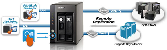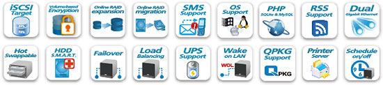 Policy-based Unauthorized IP Blocking To prevent the NAS from malicious attacks, you can create an IP filter policy to allow, deny, or auto-block the IP address or network domain which attempts to connect to the NAS via SSH/ Telnet/ HTTP(S)/ FTP/ samba/ AFP. Powerful System Management Tools Wake on LAN Enable this option to power on the NAS remotely by Wake on LAN. Wake on LAN helps you manage your NAS conveniently. Smart Fan The fan rotation speed is automatically adjusted according to the server's temperature. You can also define the system temperatures to trigger high speed or low speed rotation of the fan. By manually setting the fan rotation speed, the fan will rotate at the defined speed continuously. Instant SMS & Email Alert You can configure the SMTP server and SMSC server settings on the NAS in order to receive instant system warning or error messages by email or SMS. SSL Secure Certificate You can upload a secure certificate and an RSA private key in X.509PEM format issued by a trusted provider in order to allow the users to access the NAS by secure SSL login. Syslog Settings All the system event logs and connection logs can be saved to a remote syslog server. Network Recycle Bin The files deleted from the network shares of the NAS will be moved to a particular recycle bin folder. You can restore your data anytime in case of unintended file deletion. Comprehensive Event Log System The logs of connections to the NAS via samba, FTP, AFP, HTTP, HTTPS, Telnet, and SSH, and networking services accessed by online users are all recorded. Detailed System Information You can view the system status, e.g., CPU usage, total memory, free memory, packets received, packets sent, error packets, system up time, CPU temperature, system temperature, HDD temperature, and system fan speed. Surveillance Station The Surveillance Station enables users to configure and connect 2 IP cameras simultaneously and remotely manage the functions, including real time monitoring, recording, and playback by IE browser over the Internet. Users can flexibly define the recording settings: continuous recording, motion-detection recording, and schedule recording according to their security plan. All the files are stored in AVI format with time stamp, users can easily search and play the files by Windows Media Player. The most comprehensive support for numerous brands of IP cameras The Surveillance Station of QNAP NAS supports the leading network camera brands such as AXIS, D-Link, IPUX, LevelOne, Linksys, Panasonic and Vivotek etc. By using particular models, users can use two-way video and audio monitoring and recording, and smart PTZ control to control the monitoring direction via the web interface. Software Expansion and Website Management Web Server with Built-in phpMyAdmin With the built-in phpMyAdmin, Joomla!, editable php.ini, MySQL and SQLite, you can easily set up your web server and other online applications such as online shops and forums. MySQL Server The NAS is the most affordable choice as a standalone database server for system integrators. It can be flexibly applied in various deployments such as a database server of another web server in remote site or as an additional backup database server. Built-in DDNS support The NAS supports dynamic DNS (DDNS). You can register a unique domain name from a DDNS service provider and assign it to your NAS. There is no more need to remember a lengthy IP address! Software expansion via QPKG Center The QPKG software package platform enables you to maximize the usage of the NAS by installing additional software packages developed by the users and community worldwide. This can be done by simple "download & install" clicking without going through any complicated process.  Available QPKG software packages: Name | Description | MLDonkey (eMule) | MLDonkey (eMule) is a door to the "donkey" network, a decentralized network used to exchange big files on the Internet and present most features of the basic Windows donkey client (e.g., eMule). | Name | Description | Slim Server on Turbo Station (with SqueezeCenter 7) | Squeeze Center is the server software from Slim Device that manages common digital audio formats (.mp3, .flac, .ogg, etc.) and streams them to its players. Slim Server On Turbo Station (SSOTS) developed by flipflip is an add-on to the Turbo Station's firmware which provides the environment to run Squeeze Center 7 on it. | Name | Description | Optware Ipkg (Itsy Package Management System) | Ipkg, or the Itsy Package Management System, is a lightweight package management system designed for embedded devices. It is used in the Unslung operating system for the Linksys NSLU2, in OpenWRT, OpenMoko, Gumstix, iPAQ and now on QNAP NAS too. | Name | Description | SABnzbd+ | SABnzbd+ is a multi-platform binary newsgroup downloader written in Python language. The program works in the background and simplifies the downloading, verifying and extracting of files from Usenet. SABnzbd+ does not search for files, instead NZB files (similar to .torrent files, but for Usenet) are fed to SABnzbd+ from sites like newzbin.com, binsearch.info and tvnzb.com (Requires prior installation of Python) | Name | Description | Python | Python is a general-purpose, high-level programming language. Its design philosophy emphasizes programmer productivity and code readability. | Name | Description | WordPress | WordPress is a free, open-source personal publishing system that allows you to easily create a complex blog, or web log, on your site. Written in PHP and supported by a MySQL database, WordPress offers intuitive administrative tools and sophisticated design features that make it easy to develop and integrate a personal or professional blog on your site. | Name | Description | Joomla | Joomla! is a free, open source content management system for publishing content on the world wide web and intranets. The system includes features such as page caching to improve performance, RSS feeds, printabl