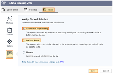 By default, this option is set to “Automatic”, in which the backup job traffic will route into the least busy network (Network adapter not set as System Default Gateway) in the Network & Virtual Switch > Network > Interfaces. If the second connection is not added in the allowed connections (as described in step 3 below), the job would not complete.