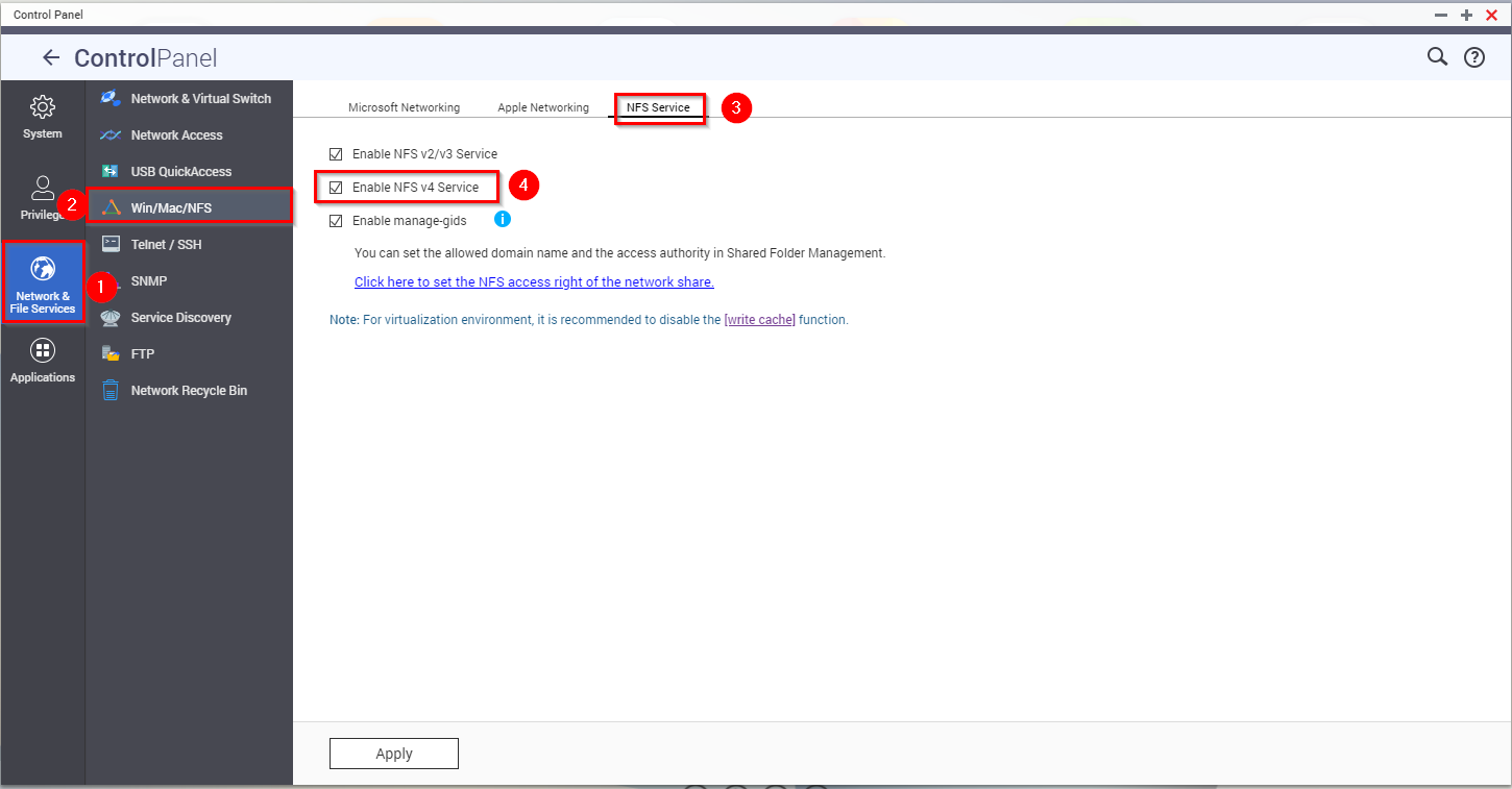 Se tentar montar uma pasta partilhada NFS a partir de outro dispositivo QNAP no HybridMount e receber um erro (por exemplo: “Falha ao ligar ao serviço remoto. Verifique as suas definições de rede e de serviço remoto.”), deve certificar-se de que ambos os dispositivos estão acessíveis e que NFS v4 está ativado no dispositivo a montar. O serviço NFS v4 pode ser ativado a partir de Painel de Controlo > Serviços de Rede e de Ficheiro > Win/Mac/NFS > Serviço NFS.