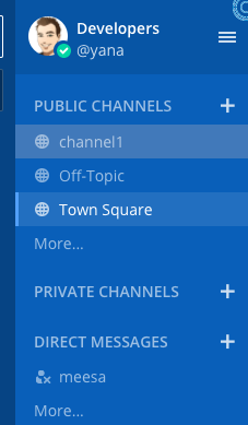 Crie um novo canal público ou privado selecionando o símbolo ao lado do cabeçalho de Canais públicos ou Canais privados no lado esquerdo. Para criar uma conversa de mensagens diretas, clique em Mais na parte inferior da lista de mensagens diretas para exibir uma lista dos membros da equipe aos quais você pode enviar mensagens. Qualquer um pode criar canais públicos ou privados, a menos que o administrador do sistema tenha limitado as permissões.