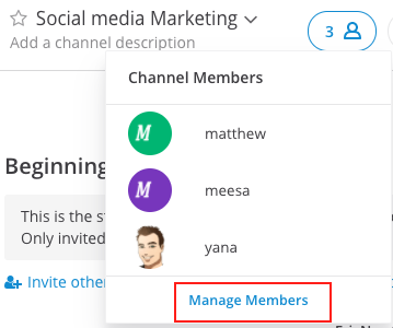 Clique no nome do canal na parte superior do painel central para abrir o menu suspenso e clique em Gerenciar membros. Qualquer membro de um canal pode remover outros membros clicando em Remover ao lado de um nome de usuário.