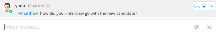 Digite @ para abrir uma lista de membros da equipe que podem ser mencionados. Para filtrar a lista, digite as primeiras letras do nome de usuário, nome, sobrenome ou apelido. Use as teclas PARA CIMA e PARA BAIXO para percorrer as entradas na lista e pressione ENTER para selecionar a pessoa que deseja mencionar. Quando selecionado, o nome de usuário substituirá o nome completo ou apelido.