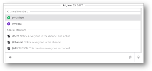 Você pode mencionar todos que estão on-line em um canal digitando @here. Isso envia uma notificação de área de trabalho e a publica para os membros do canal que estão on-line. Isso é indicado como uma menção na barra lateral. Os membros que estão off-line não receberão uma notificação e, quando eles voltarem ao site, não verão uma menção indicada na barra lateral do canal. Os membros que estiverem ausentes receberão uma notificação de área de trabalho somente se tiverem as notificações configuradas como "Toda a atividade" e não verão uma menção indicada na barra lateral.