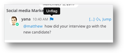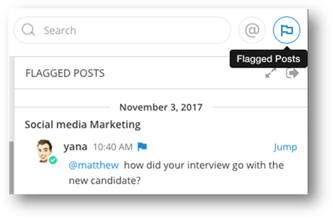 Clique em @ ao lado da caixa de pesquisa para consultar suas últimas @menções e palavras que ativam menções. Clique em Ir ao lado de um resultado de pesquisa na barra lateral à direita para abrir no painel central o canal e o local da mensagem com a menção.