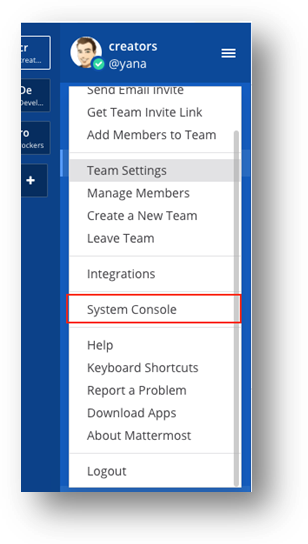 - Abra o Console do Sistema fazendo login em uma equipe existente e acessando o "Console do Sistema" no menu principal.