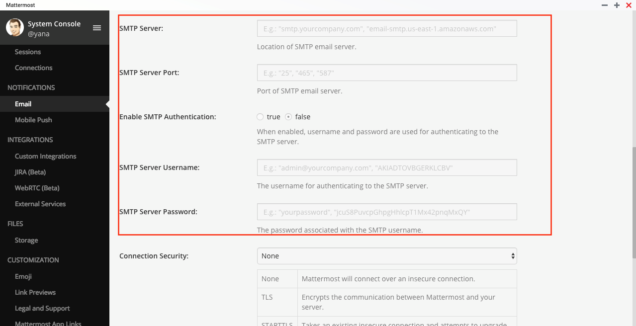 Para ser executado na produção, o Mattermost requer a ativação de um e-mail SMTP para notificações por e-mail e redefinição de senha para sistemas que usam a autenticação por e-mail.
