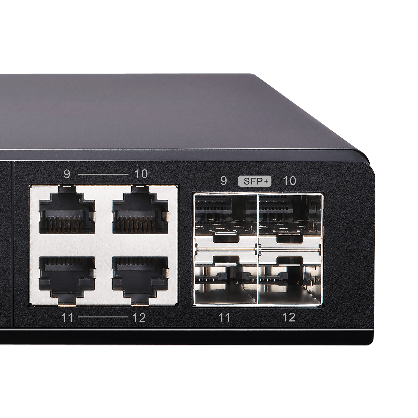 O switch QSW-1208-8C de 12 portas oferece quatro portas SFP+ (fibra) e oito portas combinadas SFP+/RJ45 (cobre) para conectar diferentes interfaces ao mesmo switch. Com interfaces RJ45, há suporte para 10GbE com cabos Cat 6a (ou superiores). Como alternativa, cabos DAC (conexão direta de cobre) podem ser usados com portas SFP+ para conexão com os servidores dentro de um rack. A capacidade de comutação do QSW-1208-8C é de 240 Gbps, garantindo o potencial completo de cada porta.