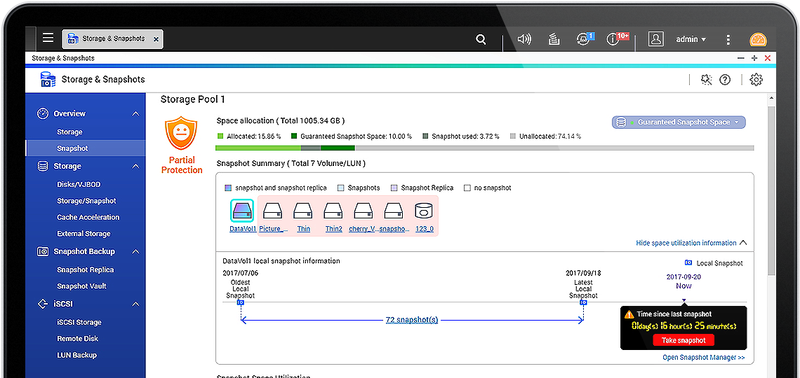 Os instantâneos protegem seus dados gravando totalmente o estado do sistema NAS e os metadados. Se ocorrer um erro, você usa os instantâneos para recuperar rapidamente o sistema para seu estado normal. Os instantâneos da QNAP são baseados em blocos e gravam apenas os dados alterados. Você não só economiza espaço de armazenamento, mas também reduz o tempo necessário de backup e da recuperação de dados.