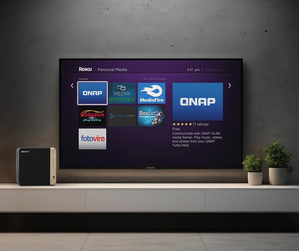 Existem várias formas de desfrutar dos seus filmes e vídeos favoritos no seu televisor com o NAS QNAP. Pode ligar diretamente através de HDMI™*, transmitir via DLNA/PLEX ou até utilizar leitores multimédia como o Google Chromecast™, Apple TV®, Roku® ou Amazon Fire TV®.