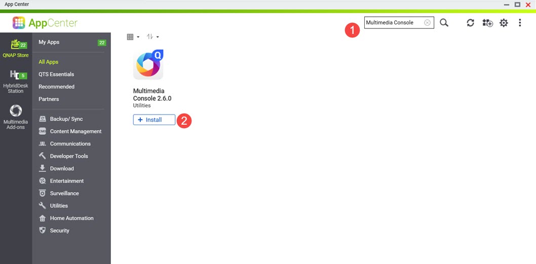 - No campo de busca, digite Multimedia Console . O aplicativo Multimedia Console aparece nos resultados da busca.