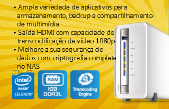 TS-251C: Modelo de torre de 2 compartimentos, processador dual-core Intel® Celeron® 2,41 GHz, memória RAM de 1GB DDR3L; 3,5 " SATA HDD; 1 x USB 3.0, 2 x USB 2.0, 1 Porta x Gigabit LAN; Saída HDMI (v1.4a, 1080p)