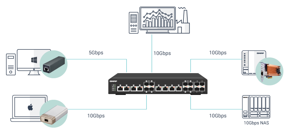 Do NAS com portas SFP+ e 10GBASE-T integradas de 10 GbE ou ao NAS com ranhuras PCIe que suportam adaptadores de rede de 10 GbE, a QNAP liderou a indústria na adoção da conectividade de 10 GbE. Outras soluções de rede de alta velocidade da QNAP incluem adaptadores de rede Thunderbolt 3 para 10 GbE e adaptadores de rede USB 3.2 Gen 1 para 5 GbE para computadores Mac®, Windows® ou computadores industriais (IPC). Todos eles podem ser utilizados com o QSW-IM1200-8C para impulsionar o desempenho da virtualização, vigilância, impressão 3D, transferências de dados de ficheiros de grandes dimensões e outras tarefas que exijam largura de banda em ambientes industriais de rede de alta velocidade.