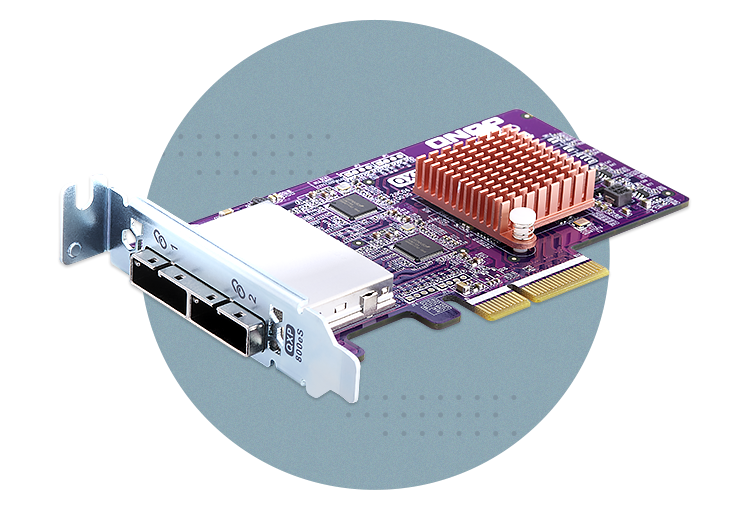 Instale uma placa PCIe QXP exclusiva em seu QNAP NAS, PC Windows® ou Ubuntu® para conectar o gabinete JBOD usando o cabo SFF-8088 (ou SFF-8644) para expansão de armazenamento fácil e flexível.