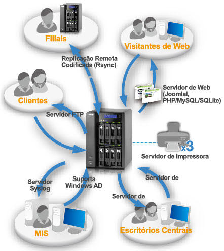 O TS-809 Pro suporta compartilhamento de arquivo entre plataformas Linux, UNIX, Mac, e Windows. Negócios versáteis são suportados, por exemplo, servidor de arquivo, servidor FTP com codificação, e servidor da impressora, servidor de rede suportada PHP/MySQL, e aplicação remota codificada por Rsync. Também, Windows AD (Diretório Ativo) é suportado para ajudar a criar um ambiente de acesso fácil e a reduzir o custo de manutenção. O registro SSH e o registro da página de rede SSL permitem aos usuários de transferir, armazenar, e compartilhar os dados seguramente.