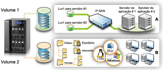 O TS-809 Pro pode agir como um NAS e um servidor de destino iSCSI ao mesmo tempo. Ele fornece uma solução iSCSI de custo eficiente para configurar um IP-SAN. O gerenciador do servidor pode fazer uso do serviço de destino iSCSI embutido para adicionar até 8 dispositivos iSCSI. Diferente LUNs (Número de Unidade Lógica) em Destino iSCSI pode ser definido como expansão de armazenamento ou destino de reserva dos servidores de aplicação existentes, tais como servidores de banco de dados e servidores de correspondência.